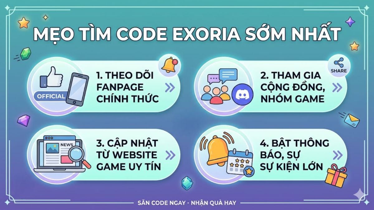 Để không bỏ lỡ code Exoria mới nhất, bạn nên chủ động theo dõi nhiều kênh cập nhật uy tín. Trước hết, hãy theo dõi fanpage hoặc các kênh chính thức của nhà phát hành để nhận code ngay khi được phát hành, đảm bảo độ chính xác và an toàn.