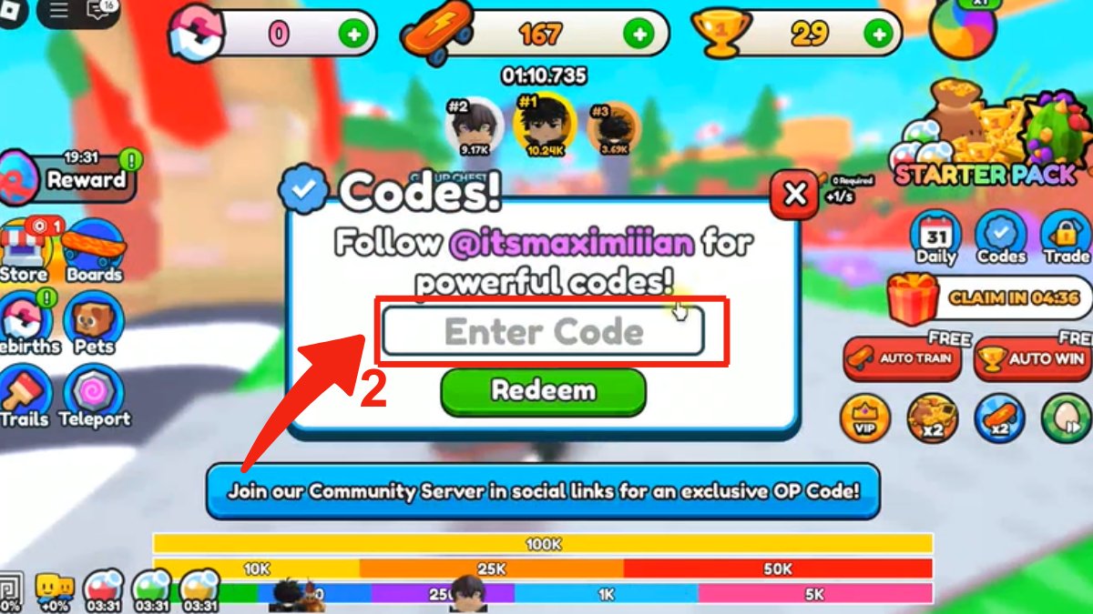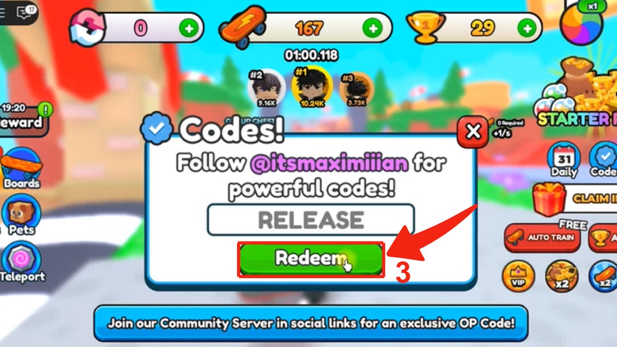 Hướng dẫn chi tiết để nhận code Skateboard Simulator sau sẽ nhanh và đúng cách. Các bước được sắp xếp đơn giản, dễ hiểu, giúp bạn thực hiện nhập code nhanh gọn và không gặp khó khăn: