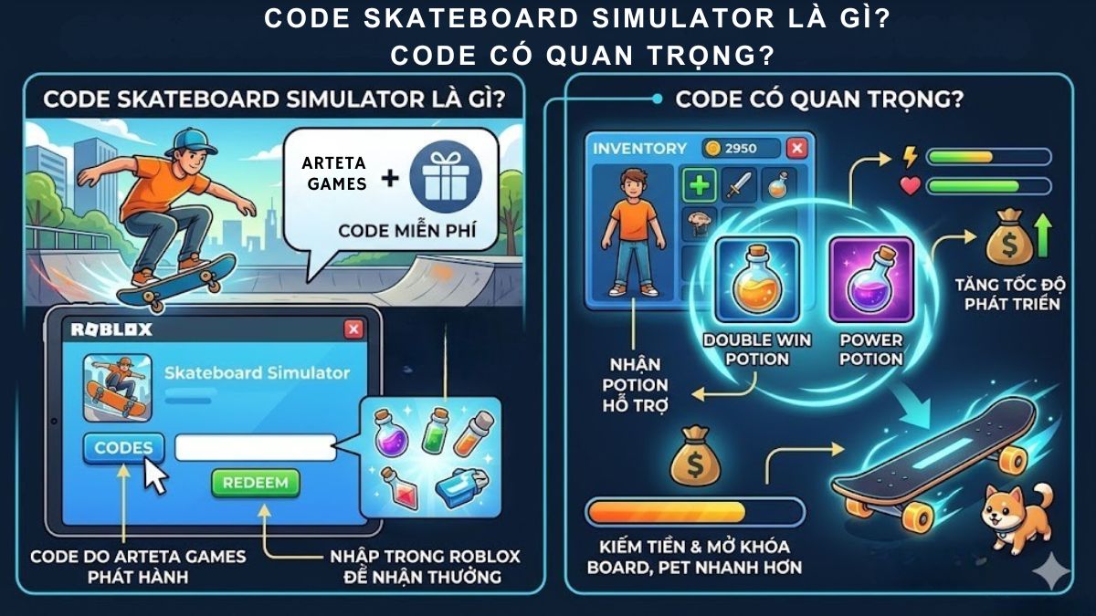 Code Skateboard Simulator 2026 thường được cập nhật theo từng sự kiện hoặc bản update mới từ nhà phát triển. Người chơi nên theo dõi và nhập sớm để nhận potion hoặc phần thưởng hỗ trợ quá trình chơi: