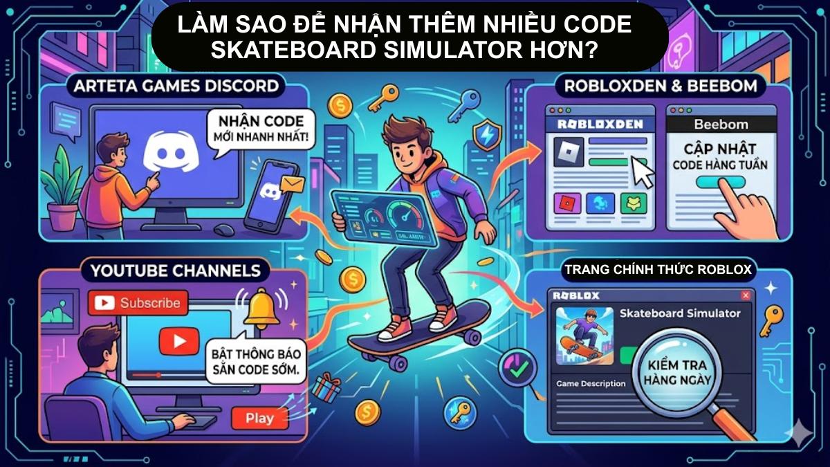Người chơi thường tham gia Discord Arteta Games để nhận thông báo code game mới Skateboard Simulator từ nhà phát triển. Các trang RobloxDen, Beebom thường cập nhật danh sách code còn hoạt động giúp bạn nhận potion kịp thời mỗi tuần.