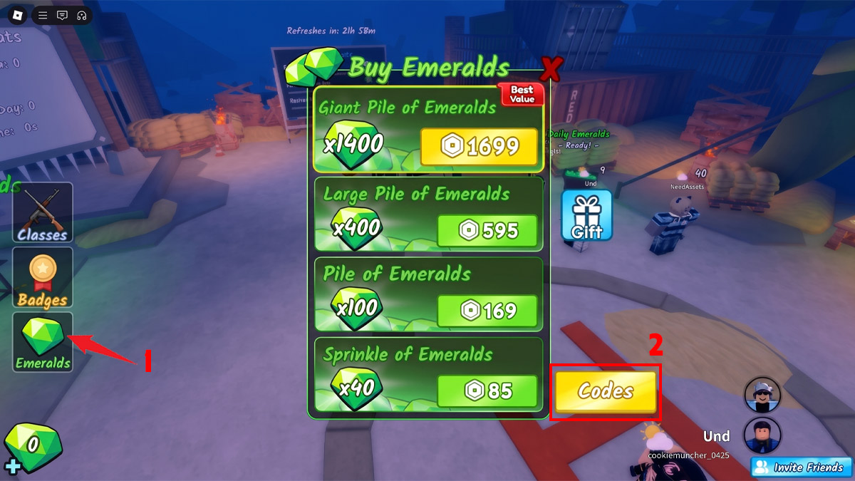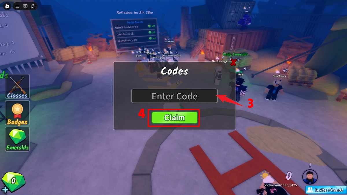 Để nhập code Survive The Apocalypse wiki nhanh, bạn chỉ cần mở game trên Roblox → Chọn Emeralds bên trái màn hình → Nhấn nút Codes màu vàng → Sau đó nhập giftcode vào ô Enter Code và bấm Claim để nhận ngay những phần thưởng miễn phí cực kỳ giá trị.