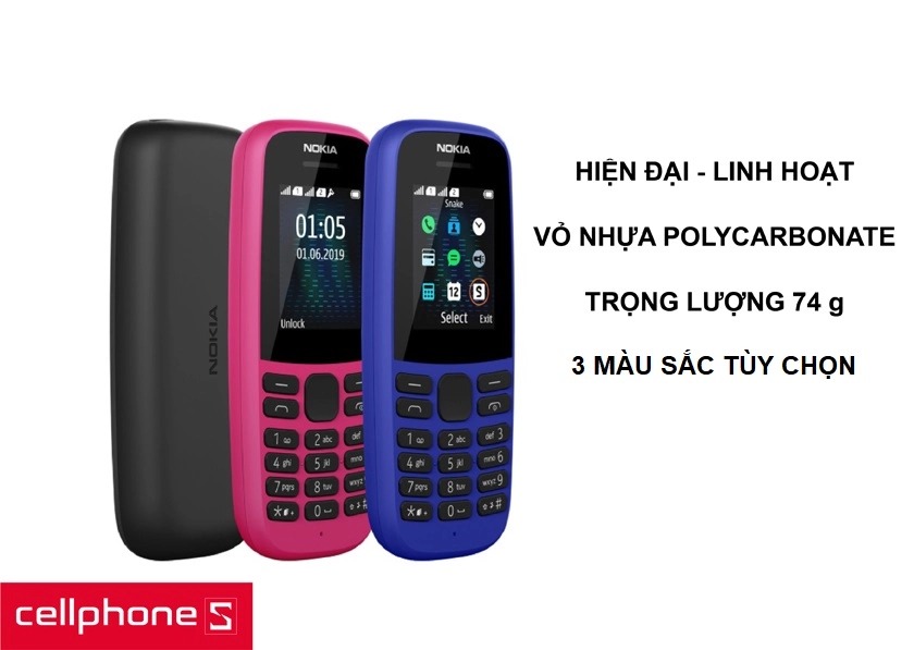 Nokia 105 2019 là model kế nhiệm Nokia 105 2017 và là phiên bản thứ 4 của chiếc điện thoại cục gạch này. Nokia 105 2019 được HMD cho biết là có thời gian chờ 25.8 ngày, 14.4 giờ đàm thọa liên tục.
