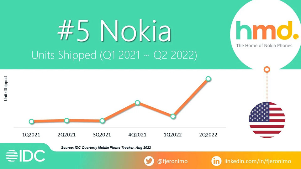 Báo cáo của IDC cho thấy lượng xuất xưởng điện thoại Nokia trong quý 2/2022 tăng vọt so với quý 1 và cùng kỳ năm ngoái. Mỹ là một thị trường rất tiềm năng đối với Nokia và hãng dự kiến sẽ duy trì hoạt động kinh doanh mạnh mẽ trong quý 3 năm 2022.