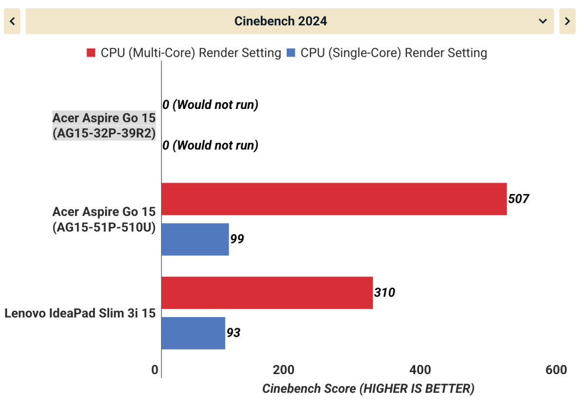 Kết quả Cinebench 2024 cho thấy Acer Aspire Go 15 (AG15-32P-39R2) đạt 507 điểm đa nhân và 99 điểm đơn nhân, vượt trội so với Lenovo IdeaPad Slim 3i 15 với 310 điểm đa nhân và 93 điểm đơn nhân. Con số này cho thấy Aspire Go 15 xử lý đa nhiệm mượt hơn và phản hồi từng tác vụ cơ bản nhanh nhạy hơn, dù vẫn thuộc phân khúc giá rẻ.
