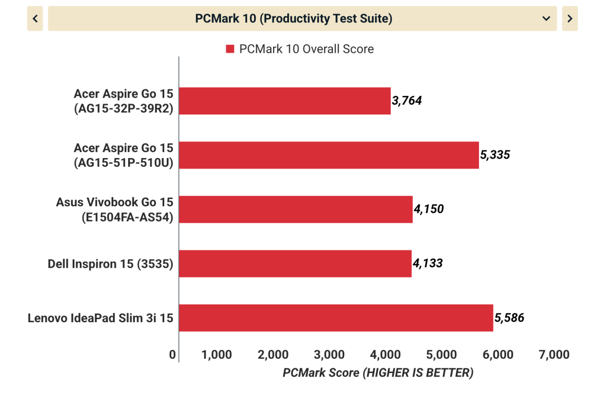 Trong bài test PCMark 10 Productivity, Acer Aspire Go 15 (AG15-32P-39R2) đạt 3,764 điểm, thấp hơn hẳn so với phiên bản AG15-51P-510U (5,335 điểm) và các đối thủ cùng phân khúc như Lenovo IdeaPad Slim 3i 15 (5,586 điểm) hay Asus Vivobook Go 15 (4,150 điểm). Kết quả này phản ánh rõ khả năng xử lý tác vụ văn phòng và đa nhiệm cơ bản của Aspire Go 15: đủ dùng cho soạn thảo, bảng tính và lướt web, nhưng không thể kỳ vọng hiệu năng cao khi mở nhiều ứng dụng nặng cùng lúc.