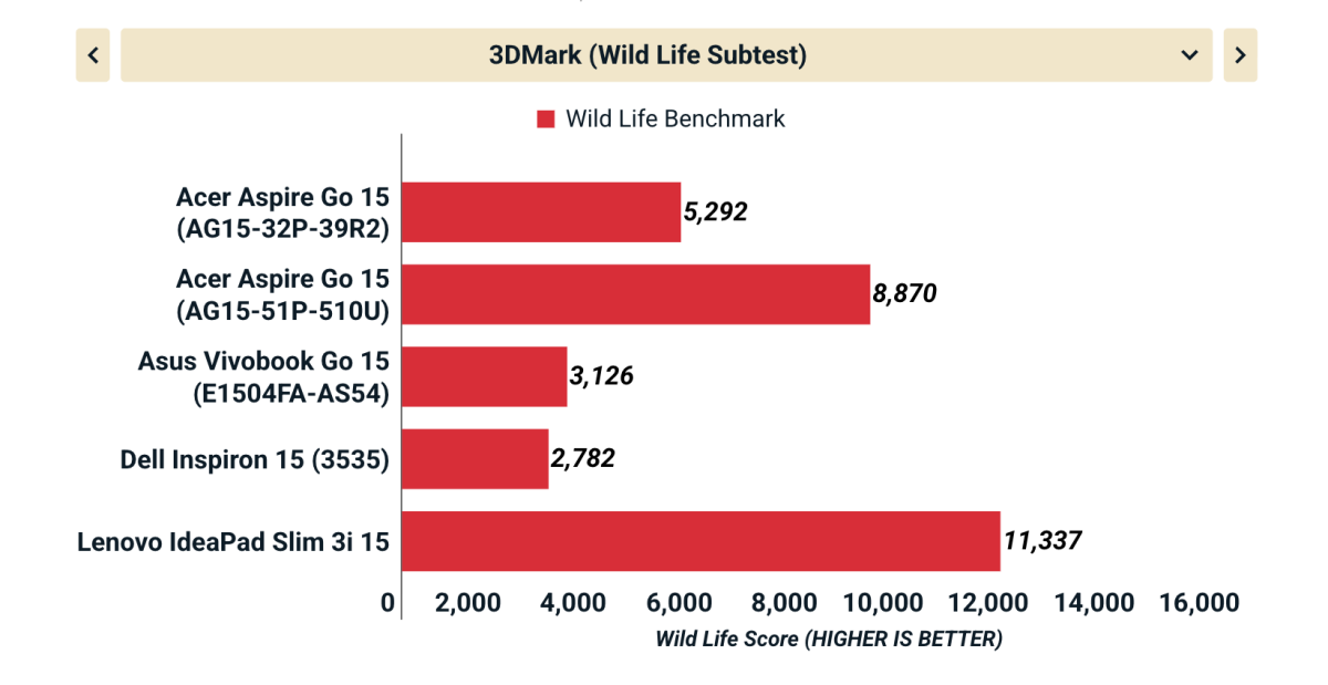 Đổi với 3DMark Wild Life, Acer Aspire Go 15 (AG15-32P-39R2) đạt 5,292 điểm, nhỉnh hơn so với Asus Vivobook Go 15 (3,126 điểm) và Dell Inspiron 15 (2,782 điểm), nhưng thấp hơn nhiều so với phiên bản AG15-51P-510U (8,870 điểm) và Lenovo IdeaPad Slim 3i 15 (11,337 điểm). Kết quả này phản ánh rõ khả năng đồ họa của GPU Intel tích hợp: đủ sức xử lý các game nhẹ, xem phim và tác vụ chỉnh sửa ảnh cơ bản, nhưng không phù hợp với game AAA hay phần mềm đồ họa nặng.