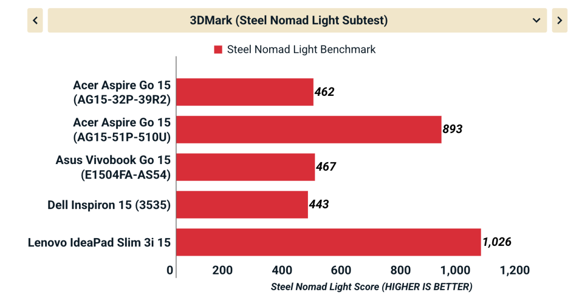 Tiếp đến 3DMark Steel Nomad Lite, Acer Aspire Go 15 (AG15-32P-39R2) đạt 462 điểm, gần tương đương với Asus Vivobook Go 15 (467 điểm) và Dell Inspiron 15 (443 điểm), nhưng thấp hơn đáng kể so với phiên bản AG15-51P-510U (893 điểm) và Lenovo IdeaPad Slim 3i 15 (1,026 điểm). Kết quả này cho thấy Aspire Go 15 chỉ phù hợp với các game nhẹ, casual hoặc những tựa game eSports đơn giản, trong khi các game AAA hay đồ họa nặng sẽ không thể chạy mượt.