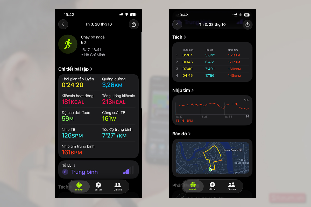 Trải nghiệm tập luyện của mình với Apple Watch Ultra 3 là không có gì để bàn cãi, việc tracking nhịp tim, lượng calo tiêu thụ, tính năng tự động nhận diện quá trình nghỉ giải lao sau từng vòng tập hoạt động cực kì trơn tru và tương đối chính xác. Apple cũng đã cải thiện về các thuật toán về đo đạc quá trình luyện tập, GPS và dữ liệu thể thao, cho kết quả đo đạc là tương đối tốt.
