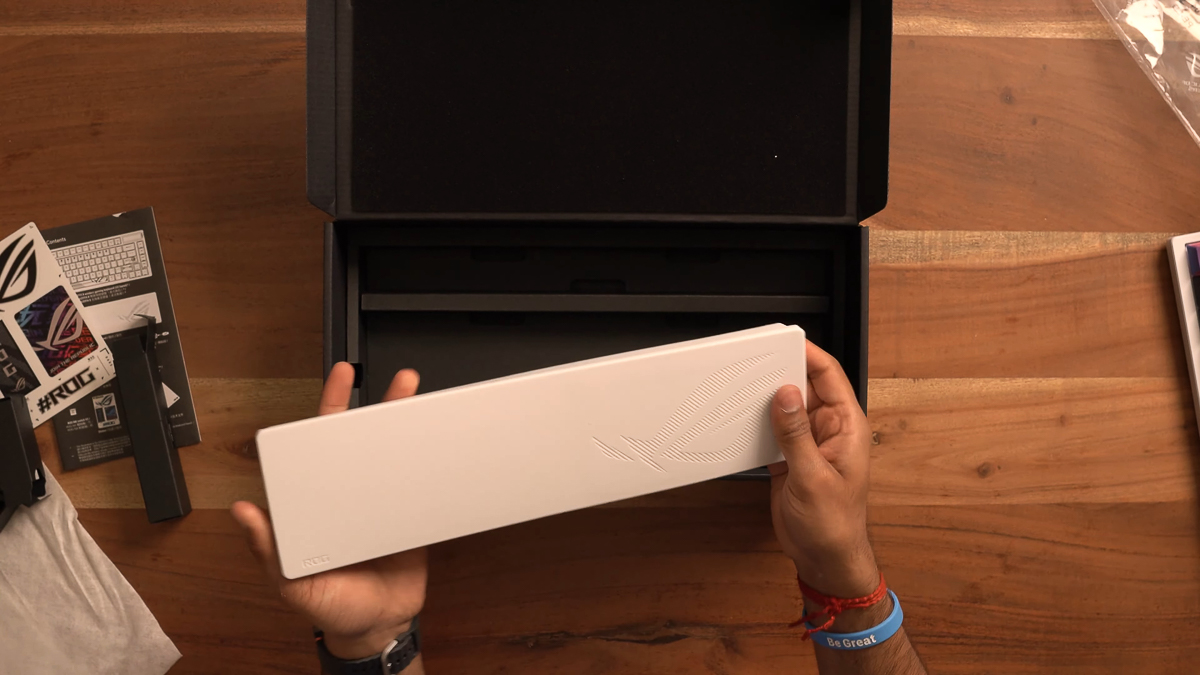 Khác biệt về mặt tiện ích sử dụng nữa đó là ASUS ROG Azoth X có đi kèm một miếng kê tay silicon rất to và dày dặn trong hộp. Miếng kê tay này sẽ góp phần tạo nên sự thoải mái cho cổ tay của mình khi gõ phím trong thời gian lâu.
