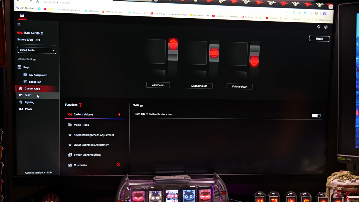 Kết hợp với phần mềm web Gear Link là cụm màn hình LED và cần gạt dọc tăng giảm âm lượng. Mình cũng có thể tùy chỉnh các chức năng lẫn cài đặt của màn hình rất tiện lợi. Vừa có thể sử dụng màn hình để thiết lập cho phím, vừa có thể dùng phần mềm để thiết lập cho màn hình. Phải nói là ASUS ROG Azoth X và phần mềm Gear Link đem lại sự kiểm soát rất tốt.