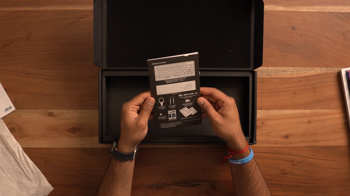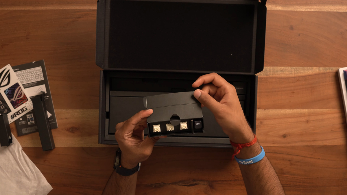 Ngoài chiếc bàn phím ASUS ROG Azoth X được bọc trong một lớp giấy, thì các phụ kiện đi kèm sẽ bao gồm sách hướng dẫn sử dụng, sticker ROG, dây cáp USB Type-C, switch ROG NX và keycap Ctrl, dongle 2.4G, kê tay có chạm khắc logo ROG và một cây switch/keycap puller.