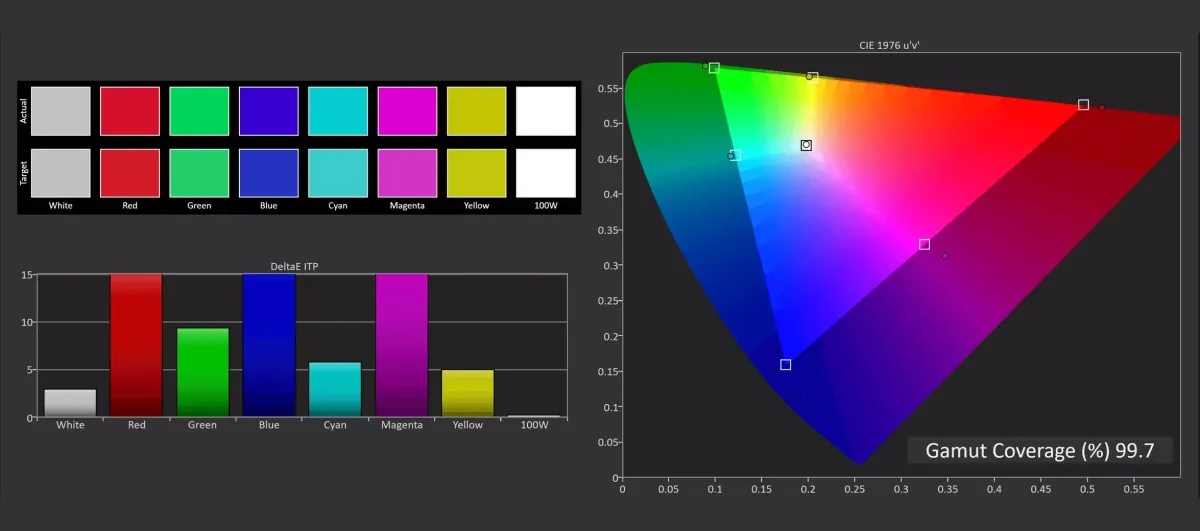 Asus ROG Swift PG27AQWP-W mang đến trải nghiệm hình ảnh ấn tượng nhờ tấm nền 1440p Primary RGB Tandem WOLED thế hệ thứ tư. Màu sắc hiển thị sống động với 99.7% DCI-P3 và 83.6% Rec.2020, gần đạt chuẩn của các màn hình LCD cao cấp, đồng thời cải thiện rõ rệt so với các WOLED thế hệ trước.