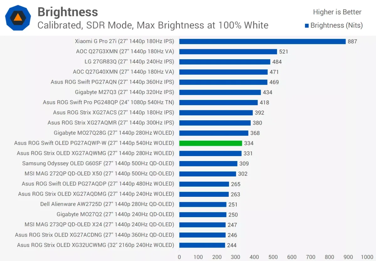 Các chế độ sRGB Cal và Windows ACM giúp cân bằng thang xám và DeltaE, đảm bảo màu sắc chính xác cho cả công việc đồ họa lẫn chơi game. Độ sáng tối đa đạt 334 nits ở chế độ SDR, lên tới 1,400 nits ở HDR với kích thước cửa sổ 2% khi bật Adjustable HDR, vượt trội so với nhiều QD-OLED cùng loại, đặc biệt trong các cảnh sáng nhỏ.