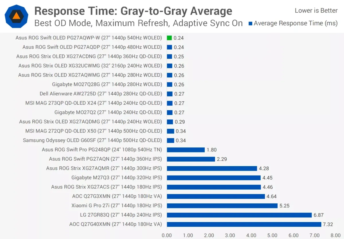 So với QD-OLED lớp phủ bóng, TrueBlack WOLED kiểm soát ánh sáng môi trường tốt hơn, giảm tình trạng màu đen bị sáng lên trong phòng có ánh sáng vừa phải, đồng thời vẫn đảm bảo trải nghiệm chơi game cả ngày lẫn đêm. Mặc dù phản chiếu trực tiếp cao hơn, nhưng nhược điểm này dễ xử lý hơn so với vấn đề ánh sáng môi trường của QD-OLED. Nhìn chung, lớp phủ TrueBlack bóng là lựa chọn linh hoạt và hiệu quả cho cả chơi game lẫn công việc hàng ngày.