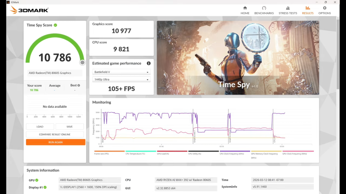 Trong bài kiểm tra 3DMark Time Spy, hệ thống đạt khoảng 10,786 điểm, một con số khá ấn tượng đối với GPU tích hợp. Kết quả này cho thấy Radeon 8060S có hiệu năng tiệm cận một số GPU rời dành cho laptop phổ thông, mang lại khả năng xử lý đồ họa tốt hơn đáng kể so với nhiều iGPU trước đây.