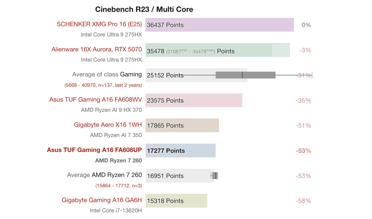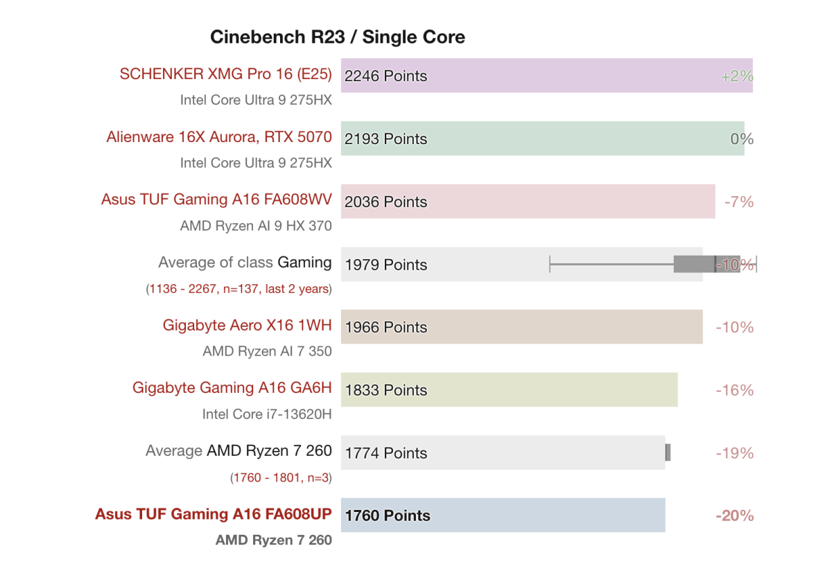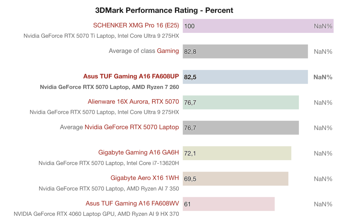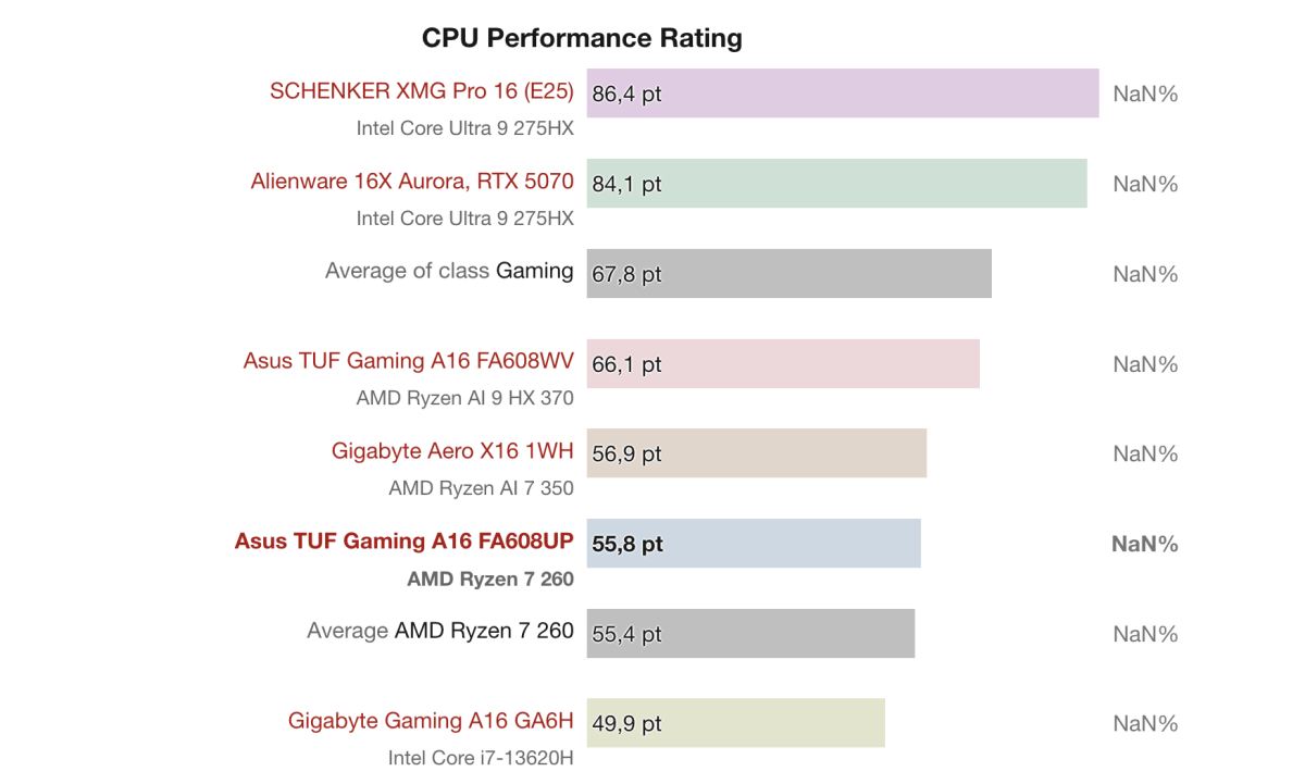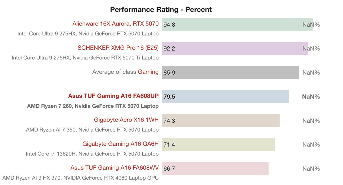 Theo Performance Rating, Asus TUF Gaming A16 FA608UP với Ryzen 7 260 + RTX 5070 Laptop đạt 79.5%, cao hơn các mẫu cùng phân khúc như Gigabyte Aero X16 (74.3%) và Gigabyte Gaming A16 GA6H (71.4%), nhưng vẫn thấp hơn các mẫu cao cấp như Alienware 16X Aurora (94.8%) và SCHENKER XMG Pro 16 với RTX 5070 Ti (92.2%).