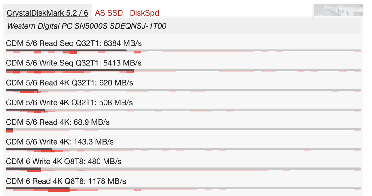 Những con số này cho thấy SSD WD SN5000S có tốc độ đọc/ghi tuần tự và ngẫu nhiên cao, giúp load hệ điều hành, game và ứng dụng mượt mà và đáp ứng tốt nhu cầu đa nhiệm.