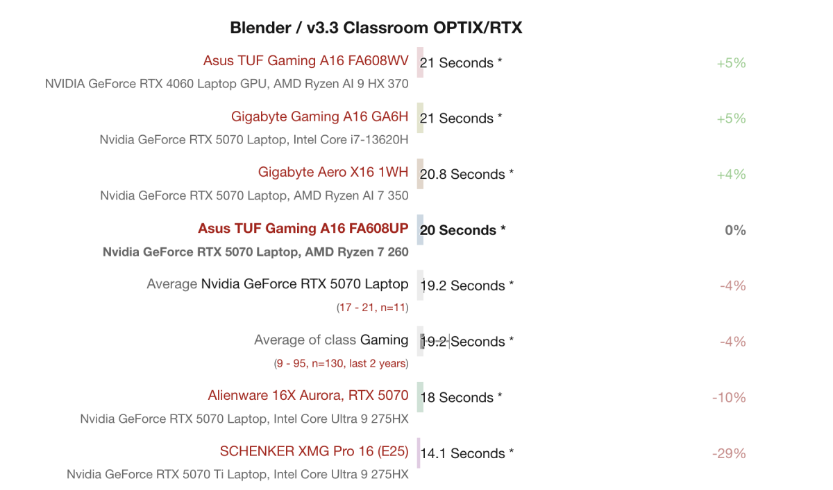 Với bài test Blender v3.3 Classroom sử dụng OPTIX/RTX, RTX 5070 Laptop trên Asus TUF Gaming A16 FA608UP hoàn thành cảnh render trong 20.0 giây, nhỉnh hơn mức trung bình của các card RTX 5070 Laptop khác (19.2 giây) nhưng vẫn thua các GPU cao cấp hơn như RTX 5070 Ti trên SCHENKER XMG Pro 16 (14.1 giây). Kết quả này cho thấy RTX 5070 trên TUF Gaming A16 có khả năng render 3D nhanh và ổn định, phù hợp cho các tác vụ sáng tạo như dựng hình, animation hoặc thử nghiệm ray tracing.