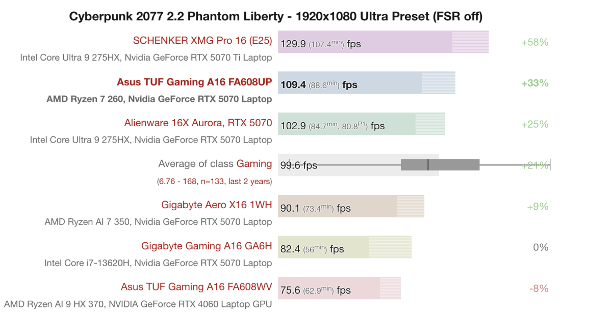 Với tựa game Cyberpunk 2077 2.2 Phantom Liberty ở 1920x1080 Ultra Preset (FSR tắt), Asus TUF Gaming A16 FA608UP với Ryzen 7 260 + RTX 5070 Laptop đạt trung bình 109.4 FPS, khung hình thấp nhất rơi vào 88.6 FPS. Kết quả này cao hơn mức trung bình của dòng gaming laptop cùng phân khúc (99.6 FPS) và vượt Alienware 16X Aurora cùng card RTX 5070 (102.9 FPS).