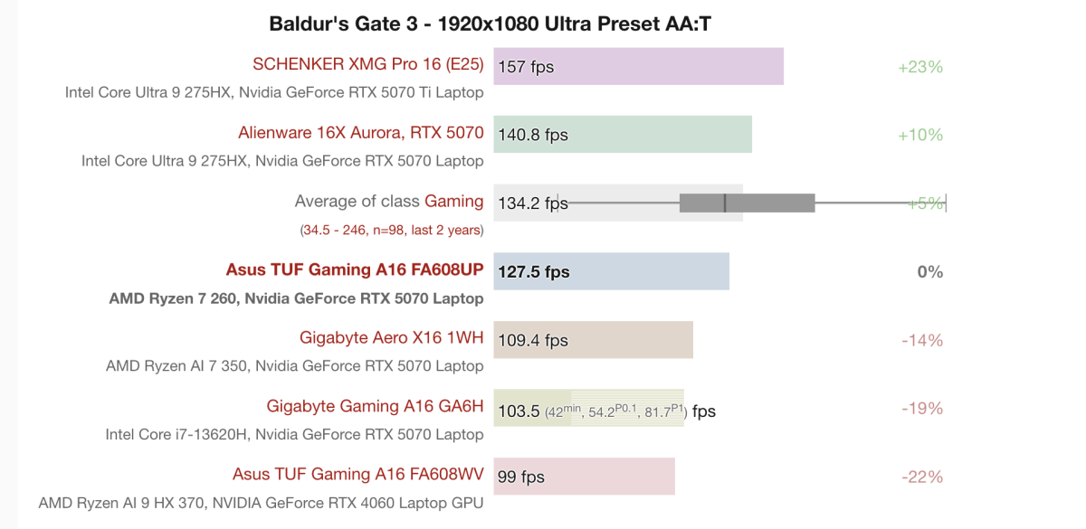 Khi chơi Baldur's Gate 3 ở 1080p Ultra Preset AA:T, Asus TUF Gaming A16 FA608UP với Ryzen 7 260 + RTX 5070 Laptop đạt trung bình 127.5 FPS, cao hơn nhiều mẫu phổ thông và nhỉnh hơn Gigabyte Aero X16 (109.4 FPS). Mức FPS này vẫn thấp hơn các mẫu cao cấp như SCHENKER XMG Pro 16 với RTX 5070 Ti (157 FPS) và Alienware 16X Aurora (140.8 FPS).