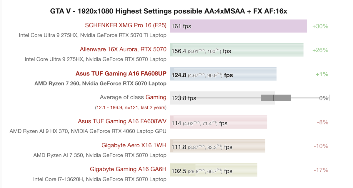 Chạy GTA V ở 1080p với thiết lập Highest Settings, AA:4xMSAA + FX AF:16x, Asus TUF Gaming A16 FA608UP với Ryzen 7 260 + RTX 5070 Laptop đạt trung bình 124.8 FPS, nhỉnh hơn mức trung bình của dòng gaming laptop cùng phân khúc (123.8 FPS) và vượt Gigabyte Aero X16 (111.8 FPS). Mức FPS này vẫn thấp hơn các mẫu cao cấp hơn như SCHENKER XMG Pro 16 với RTX 5070 Ti (161 FPS) và Alienware 16X Aurora (156.4 FPS).