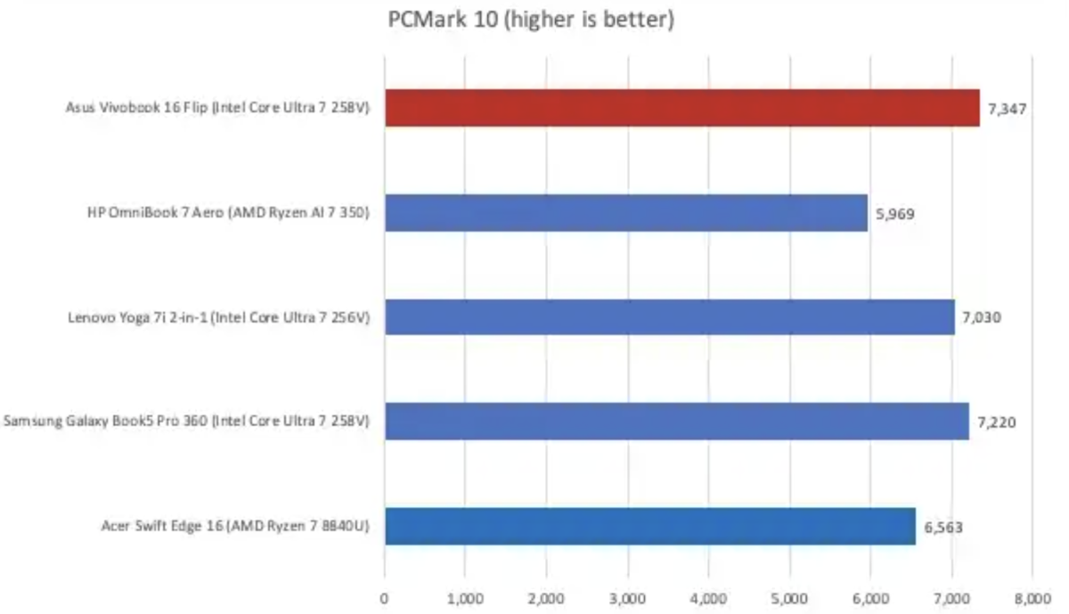 ASUS Vivobook 16 Flip khởi đầu ấn tượng trong bài test PCMark 10, một công cụ đánh giá toàn diện hệ thống. Bài test này ít thiên về hiệu năng CPU đa luồng và có lợi cho GPU, điều này giúp Vivobook 16 Flip thể hiện tốt.