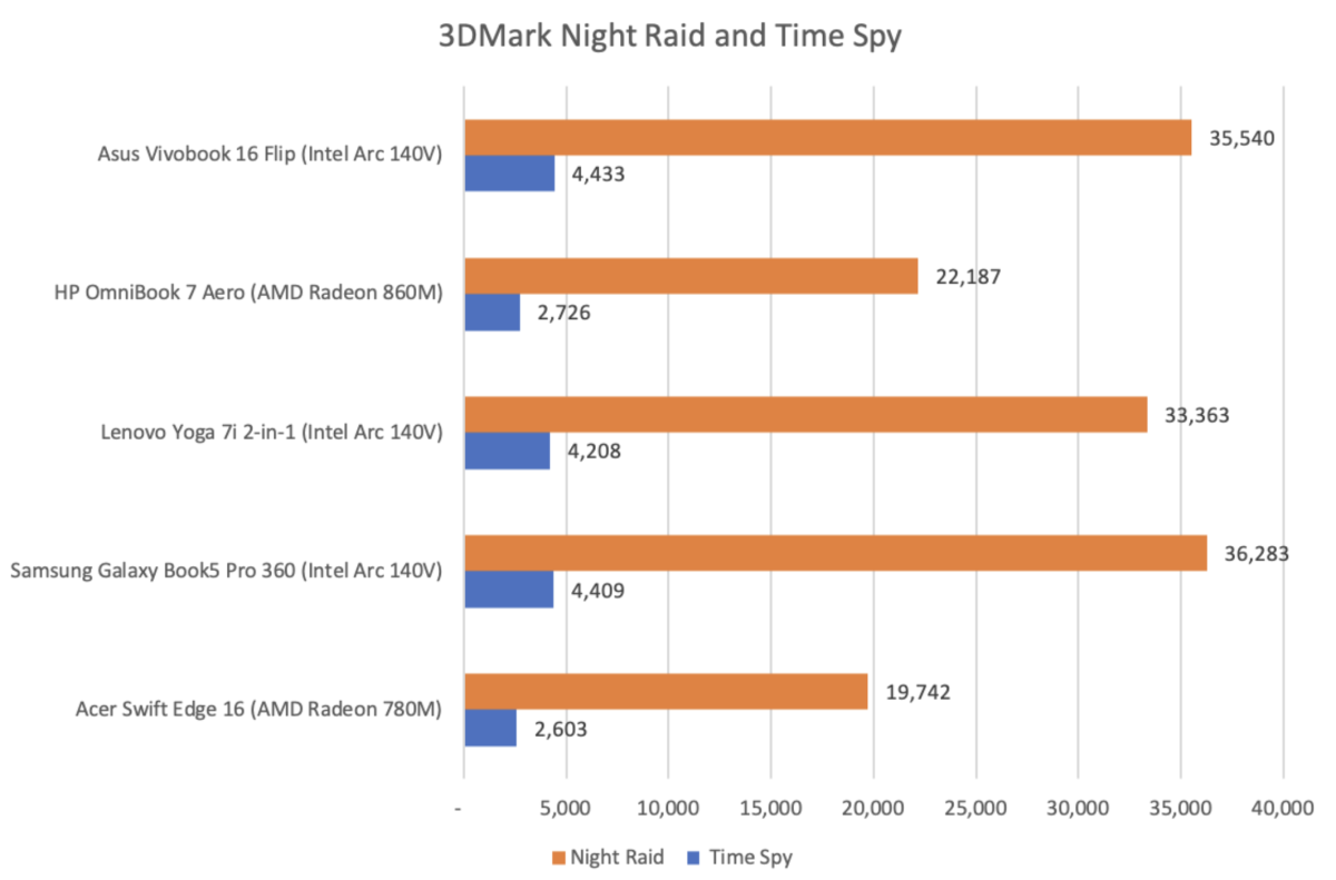 Trong các bài test 3D, Intel Arc 140V thể hiện khả năng đồ họa tốt. Đây là giải pháp đồ họa tích hợp mạnh mẽ và Vivobook 16 Flip giúp GPU này vượt trội hơn so với các lựa chọn Radeon của AMD. Trong khi Samsung Galaxy Book5 Pro 360 gần như ngang bằng, hiệu năng của Vivobook 16 Flip vẫn rất ổn định.