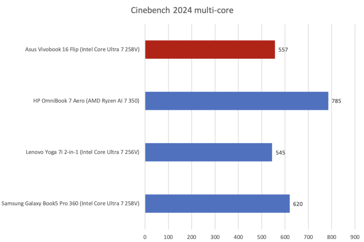 Trong bài test Cinebench 2024, một công cụ đánh giá hiệu năng đa luồng nặng, tình hình hơi khác. Intel Core Ultra 7 258V đạt 557 điểm, với tám nhân nhưng chỉ một nửa là nhân hiệu năng cao. Nhiều đối thủ cung cấp nhiều nhân hiệu năng cao hơn, và điều này thể hiện rõ khi so sánh. Ví dụ, AMD Ryzen AI 7 350 đạt 785 điểm, vượt trội hơn hẳn trong bài test này.