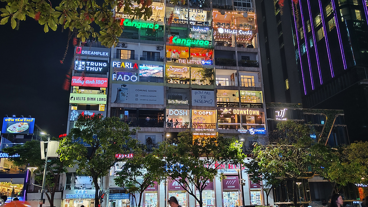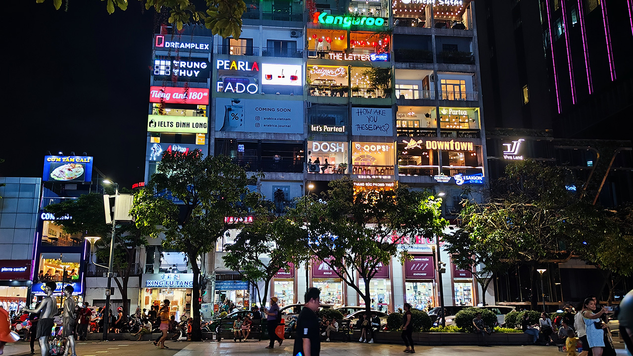 Chuyển sang môi trường phức tạp hơn với nhiều ánh đèn như khu phức hợp ăn uống ở Phố đi bộ Nguyễn Huệ. Dải nhạy sáng trên cả 2 chế độ thể hiện tốt với nhiều chi tiết và màu sắc sinh động. Vẫn như những bức ảnh ở phía trên, chế độ tự động vẫn cho khả năng thu sáng ấn tượng hơn nhưng lại thể hiện sai lệch phần màu sắc bên trong các gian hàng.