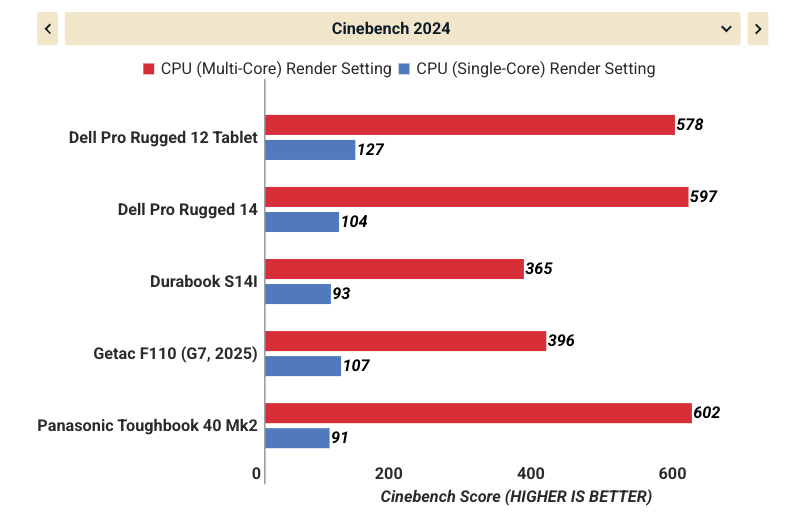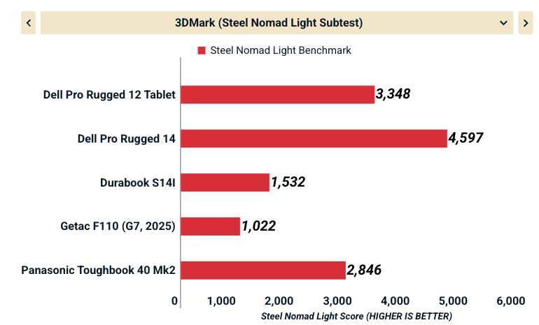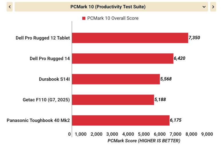 So với các mẫu như Dell Pro Rugged 14 hay Panasonic Toughbook 40 Mk2, hiệu năng của Pro Rugged 12 Tablet có phần thấp hơn, nhưng vẫn nhỉnh hơn một số thiết bị như Durabook S14I. Điều này phản ánh rõ sự cân bằng giữa hiệu năng và mức tiêu thụ điện năng, thay vì tập trung tối đa vào sức mạnh xử lý.