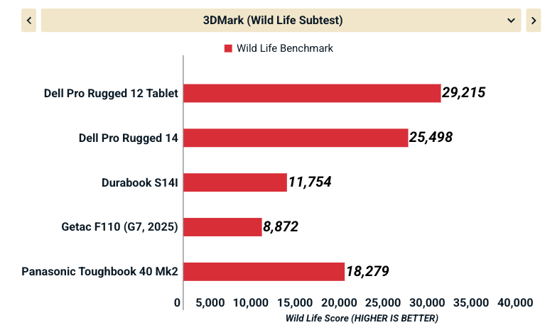 Dell Pro Rugged 12 Tablet được trang bị GPU Intel Arc Graphics, mang lại hiệu năng đồ họa ở mức khá tốt trong phân khúc thiết bị rugged. Trong bài test 3DMark Wild Life, máy đạt 29,215 điểm, vượt qua nhiều đối thủ như Durabook S14I hay Getac F110, đồng thời cho thấy khả năng xử lý đồ họa ổn định trong các tác vụ thực tế.