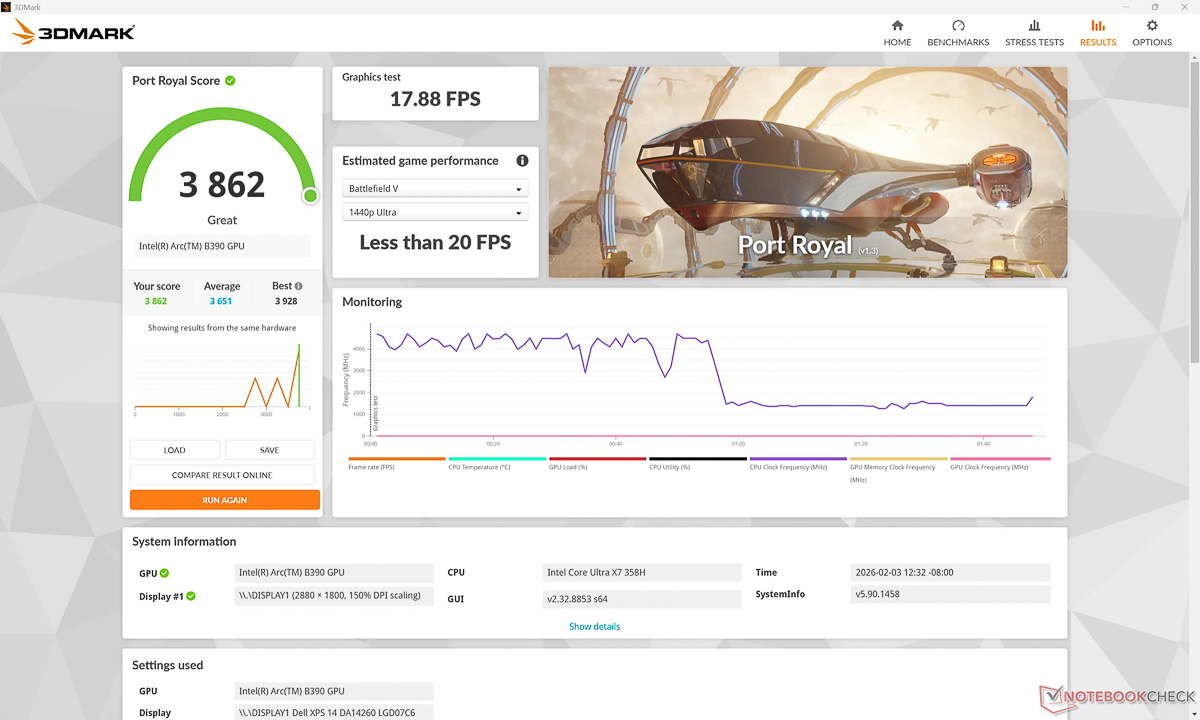 Sử dụng phần mềm 3DMark với các bài test đa dạng như Fire Strike, Time Spy, Port Royal và và Speed Way, các ngưỡng điểm số sau khi thử nghiệm đều cho ra kết quả từ Excellent cho tới Legendary. Thể hiện được sức mạnh đồ họa mạnh mẽ ổn định của iGPU Intel Arc B390. Người dùng Dell XPS 14 2026 hoàn toàn yên tâm khi thực hiện những tác vụ đồ họa hạng nặng.