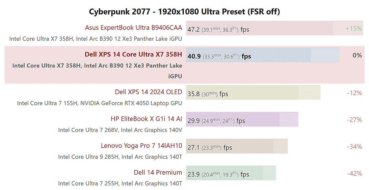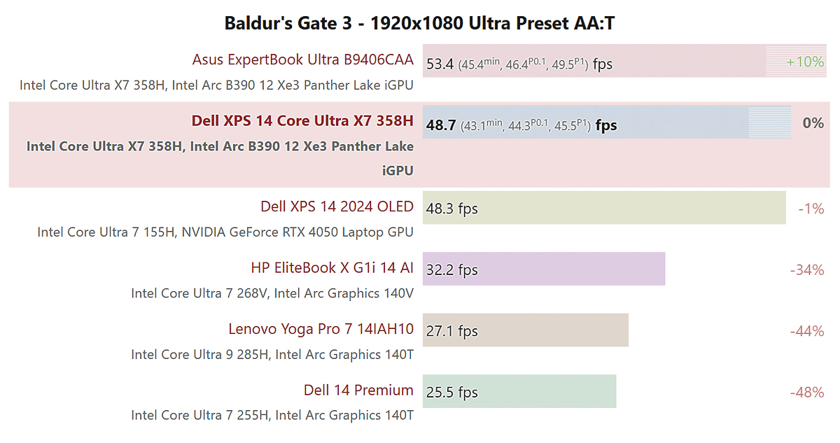 Thử nghiệm gaming với 4 tựa game có ngưỡng đòi hỏi hiệu năng đồ họa từ vừa phải cho tới nặng, bao gồm GTA V, Baldur’s Gate 3, Final Fantasy XV và cuối cùng là Cyberpunk 2077. Ở mức thiết lập High, Intel Arc B390 đem lại mức FPS có thể gọi là chơi được từ 40 - 52 FPS. Vì đây là mức thiết lập High, nên nếu gia giảm xuống Medium hoặc thậm chí là Low thì có thể đảm bảo được FPS sẽ trên 60 ổn định.