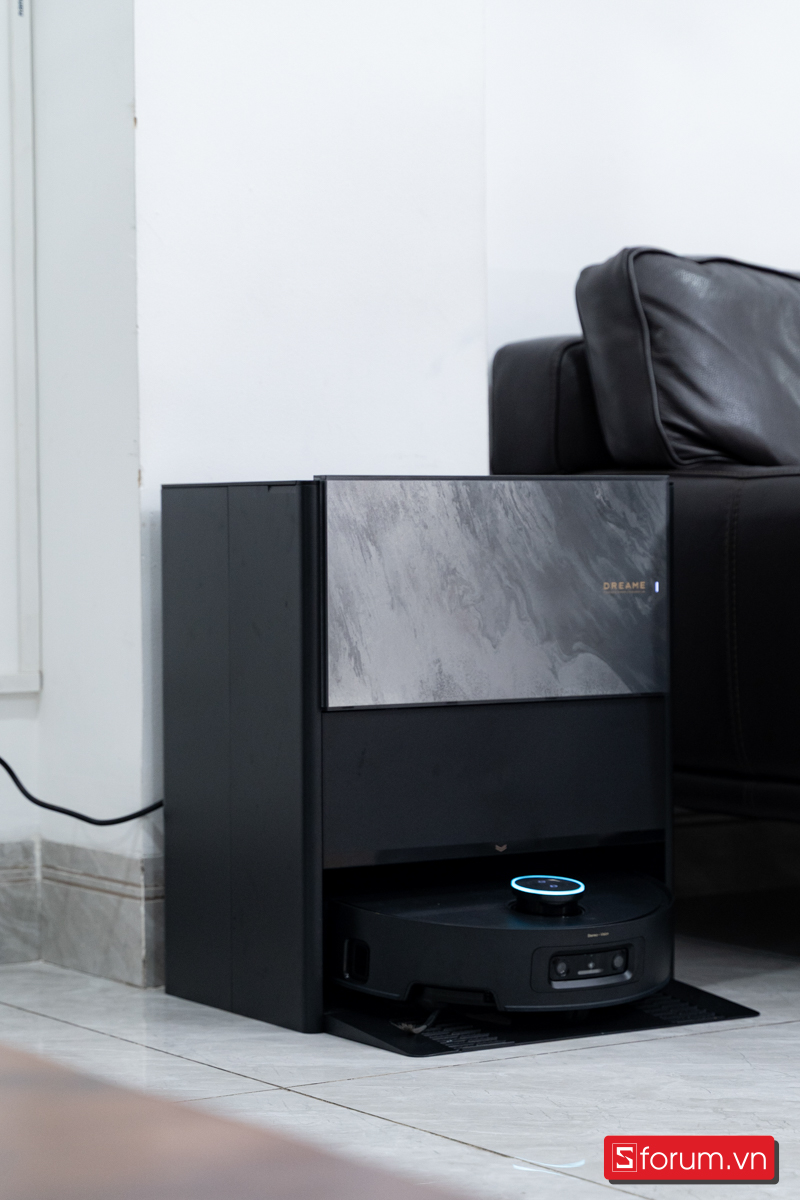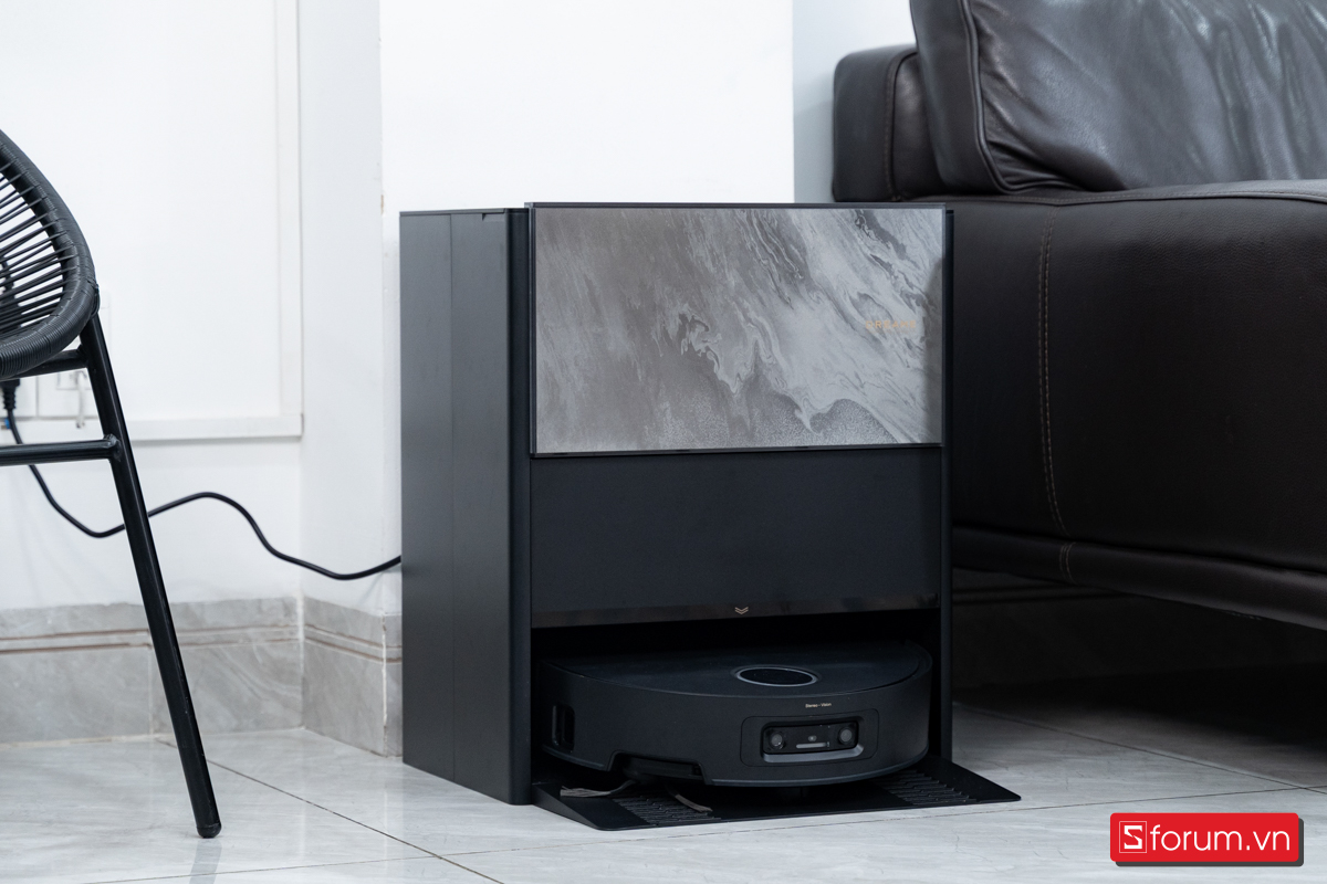 Dock sạc được làm mới, gọn và tinh tế hơn. Mặt trước ốp vân đá hoa cương phối viền vàng đen nhìn sang hơn hẳn, dễ hòa vào không gian nội thất. Dù nhỏ hơn so với dock L20 Ultra, nó vẫn giữ đầy đủ tính năng: Tự hút rác, sấy túi bụi, giặt và sấy cuộn lăn bằng nước nóng 100°C, khử khuẩn UV và khay chứa nước đôi riêng biệt. Mình đặt ngay phòng khách và cảm giác như một món nội thất chứ không phải thiết bị gia dụng.