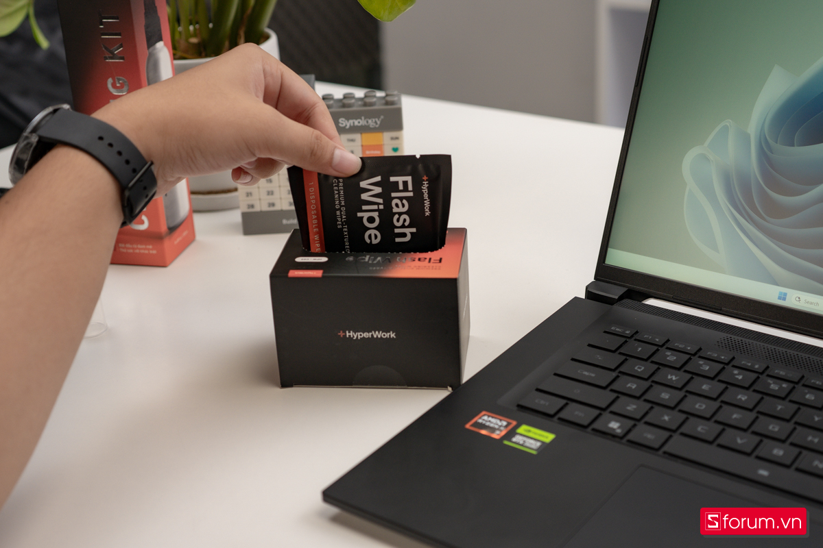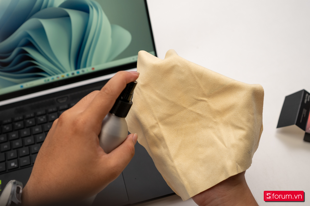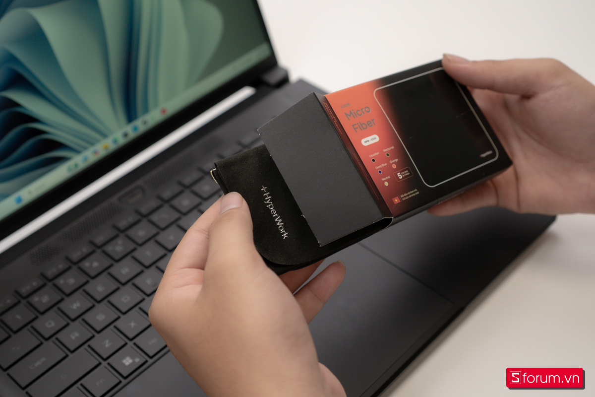 Để giữ cho màn hình luôn sạch và trong, mình dùng thêm bộ vệ sinh màn hình Hyper Cleaning và khăn lau Microfiber của Hyperwork. Chai dung dịch kèm khăn giúp lau bụi và vết bẩn nhanh gọn, không để lại vệt, đồng thời an toàn cho lớp phủ chống chói. Đây là một phụ kiện nhỏ nhưng khá hữu ích nếu bạn thường xuyên di chuyển và cần máy luôn gọn gàng, sáng rõ.