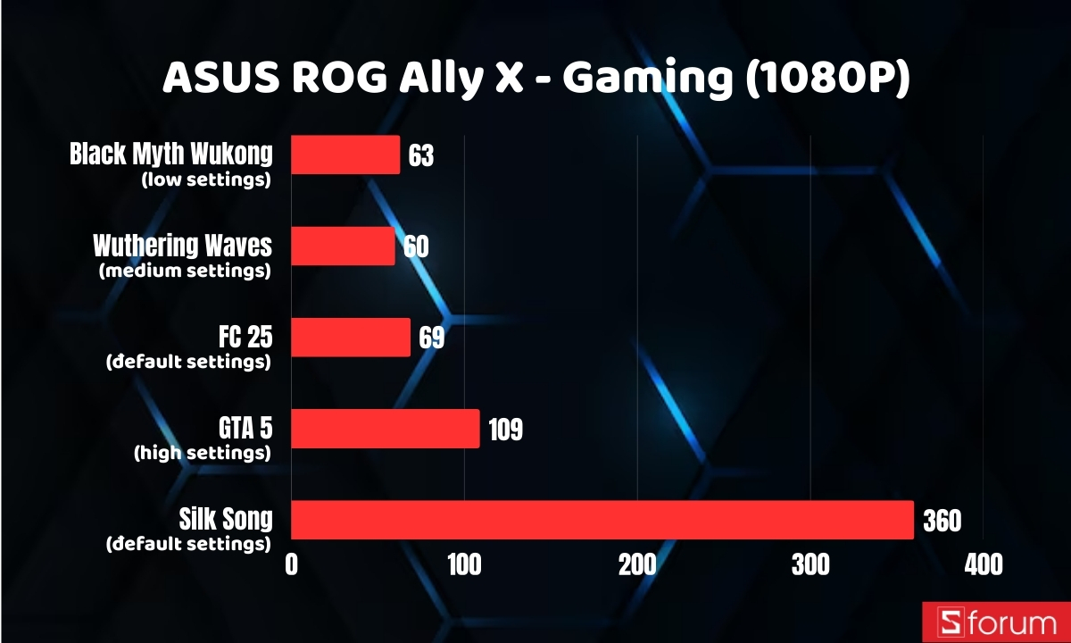 Đặc biệt, với Silk Song, Ally X gần như “dư sức”, FPS có thể lên tới 360, CPU chỉ sử dụng 24 đến 42% trong khi GPU dao động 86 đến 97%. Điều này cho thấy với game nhẹ hoặc indie, ASUS ROG Ally X không chỉ mượt mà mà còn rất dư dả hiệu năng, phù hợp để chơi lâu dài mà không quá lo về nhiệt hay độ ổn định.