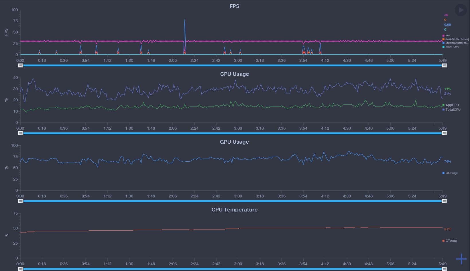 Từ biểu đồ trên đã cho thấy, GPU khi này đã hoạt động đáng kể so với tựa game trước (41%),trong khi CPU lại hoạt động nhẹ nhàng hơn trước. Mức FPS tuy ổn định ở 40 nhưng đã xuất hiện khoảng drop, tuy vậy không đáng kể, các khoảng thời gian còn lại máy vẫn duy trì tốt. Về nhiệt độ, máy đã nóng hơn so với khi chơi Liên Quân, tuy nhiên nếu so với những chiếc điện thoại đối thủ như ROG Phone 5S, Red Magic 6S Pro vẫn mát hơn, có lẽ nhờ việc trang bị quạt tản nhiệt nằm bên trong máy thay vì bên ngoài nên hiệu quả tản nhiệt có khác biệt rõ rệt.Video trải nghiệm khi chơi game: