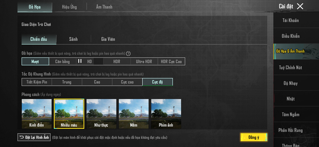 Tiếp đến là PUBG Mobile, Galaxy A35 có thể chơi được ở mức đồ hoạ cao nhất là HDRvớitốc độ khung hình mức cực cao nhưng mình ưu tiên hơn về độ mượt mà với tốc độ khung hình tối đa và đạt 60FPS thì mình sẽ để thiết lập ở mức mượtđể tốc độ khung hình ở mứccực độ.