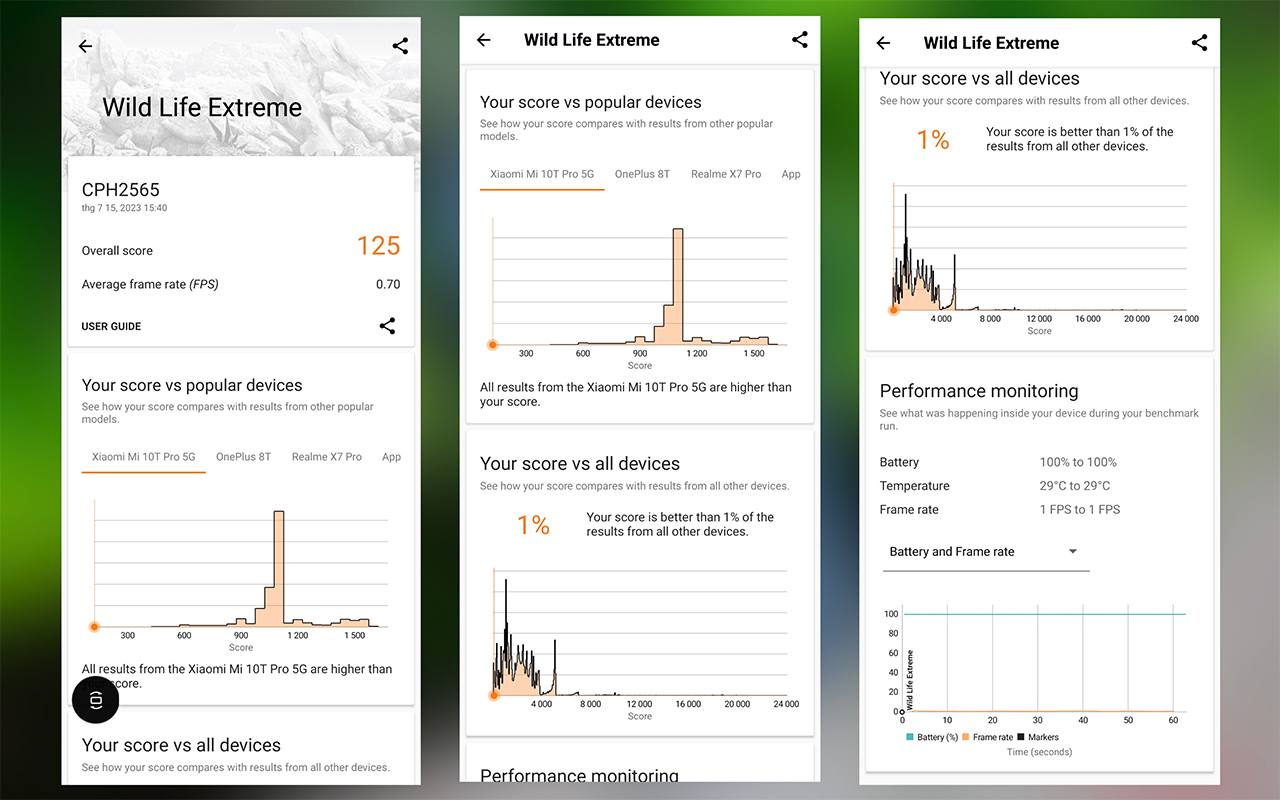 Đầu tiên Với bài test Wild Life Extreme, OPPO A78 4G đạt tổng điểm là 125 điểm, FPS trung bình của máy đạt 0,70 FPS. Một điểm nữa mình thấy thích trên em nó trong quá trình test máy giữ nguyên 100% pin, nhiệt độ của máy không tăng luôn ở mức 29 độ C. Điều này phần nào cho thấy thiết bị mình đang dùng có pin và nhiệt độ rất ổn khi sử dụng với tác vụ nhẹ nhàng.