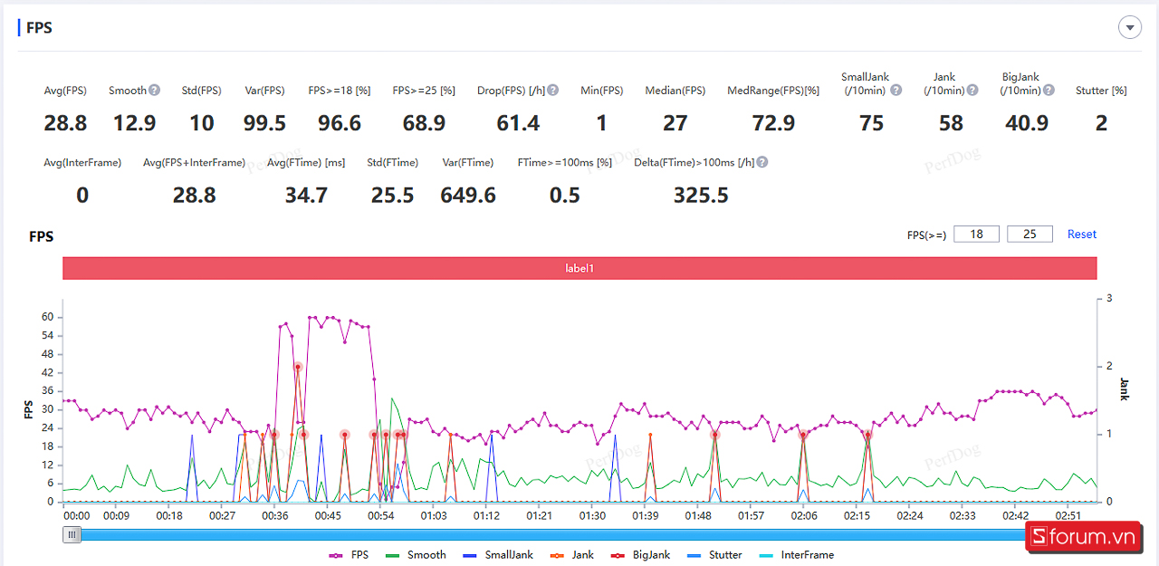 Hiện tượng giật lag cũng hay xảy ra và bạn có thể thấy rằng đường FPS thường xuyên bị giảm xuống còn 20 FPS. Tuy nhiên, may mắn là tần suất của hiện tượng này không quá nhiều.