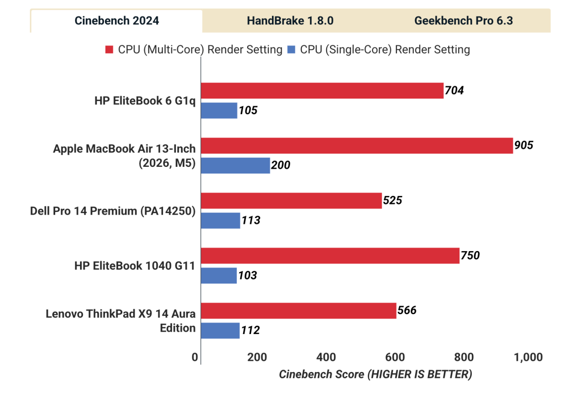 Khi kiểm tra với Cinebench 2024, HP EliteBook 6 G1q đạt 704 điểm ở bài test đa nhân và 105 điểm ở bài test đơn nhân. Kết quả này cho thấy vi xử lý Snapdragon X Plus mang lại hiệu năng khá ổn định cho các tác vụ văn phòng, đặc biệt là khi xử lý đa nhiệm hoặc làm việc với nhiều ứng dụng cùng lúc.