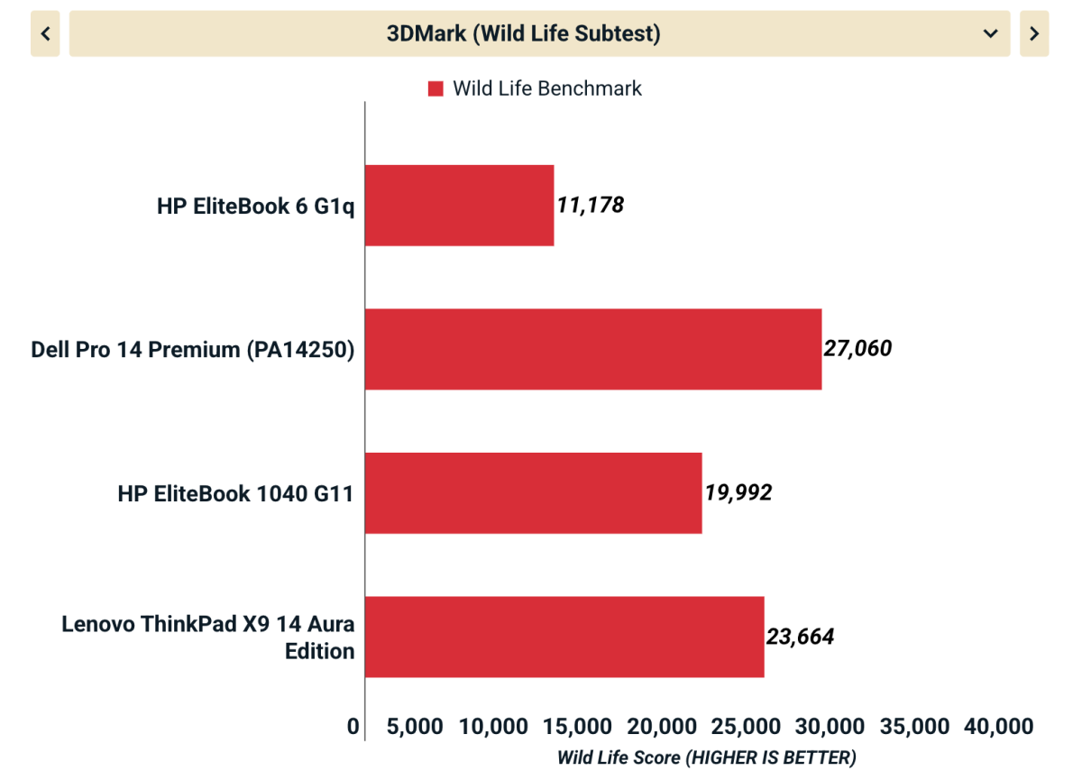 Tuy nhiên, so với một số mẫu laptop khác trong cùng bài test, hiệu năng GPU của máy vẫn ở mức thấp hơn. Điều này cho thấy EliteBook 6 G1q chủ yếu được tối ưu cho các tác vụ công việc và hiệu suất năng lượng thay vì xử lý đồ họa nặng. Vì vậy, máy vẫn phù hợp với người dùng văn phòng hoặc doanh nghiệp, nhưng sẽ không phải lựa chọn lý tưởng cho các công việc yêu cầu đồ họa cao hay chơi game nặng.
