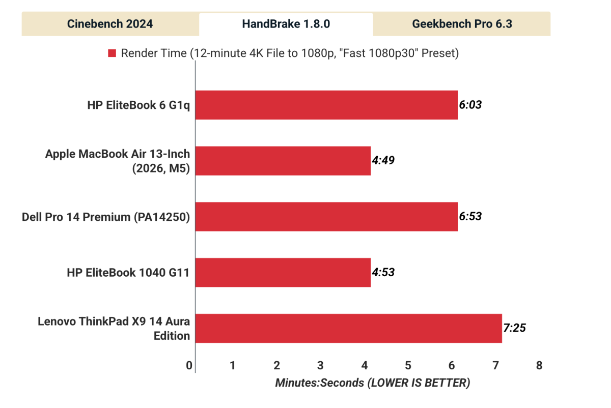 Ngoài ra, với bài kiểm tra HandBrake 1.8.0 với tác vụ chuyển đổi video 4K sang 1080p, HP EliteBook 6 G1q hoàn thành bài test trong 6 phút 03 giây. Kết quả này cho thấy máy vẫn có thể xử lý các tác vụ liên quan đến xử lý video hoặc công việc nặng hơn ở mức chấp nhận được, dù hiệu năng vẫn thấp hơn một số mẫu laptop dùng chip mạnh hơn. Với các nhu cầu làm việc thông thường trong môi trường văn phòng, hiệu năng của máy vẫn đủ ổn định để đáp ứng tốt.
