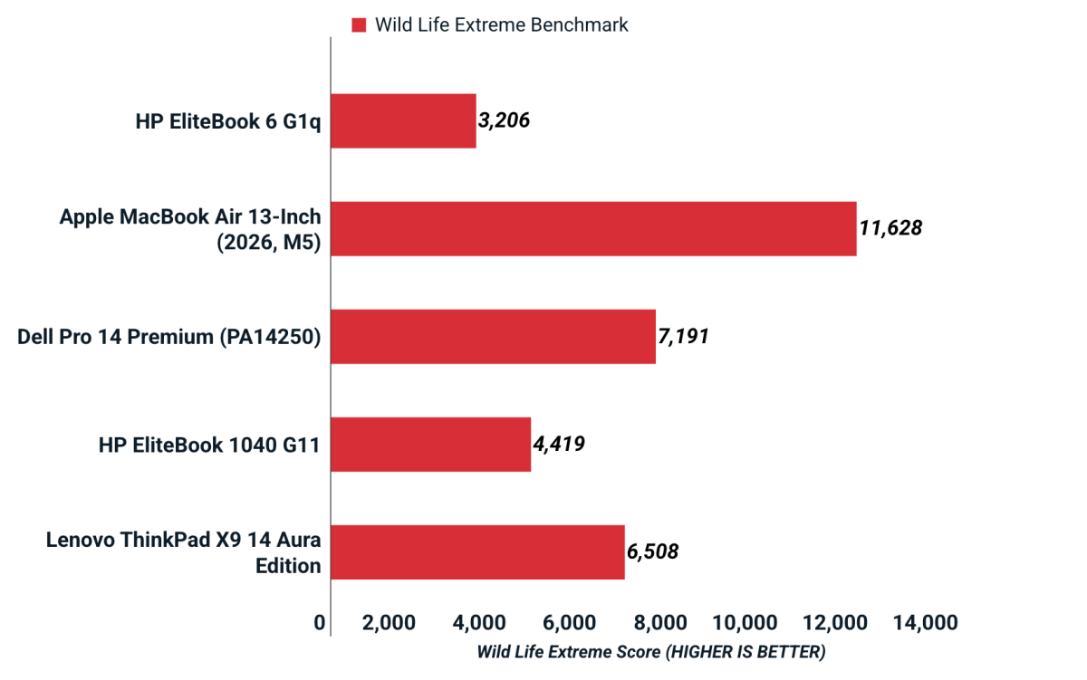 Trong bài kiểm tra 3DMark Wild Life Extreme, HP EliteBook 6 G1q đạt 3,206 điểm. Kết quả này cho thấy GPU tích hợp Adreno X1-45 vẫn có thể xử lý các tác vụ đồ họa nặng hơn ở mức cơ bản, nhưng hiệu năng vẫn thấp hơn đáng kể so với một số mẫu laptop khác trong cùng bảng so sánh. Điều này cho thấy EliteBook 6 G1q được tối ưu chủ yếu cho hiệu suất làm việc và tiết kiệm điện năng, thay vì các tác vụ đồ họa chuyên sâu.