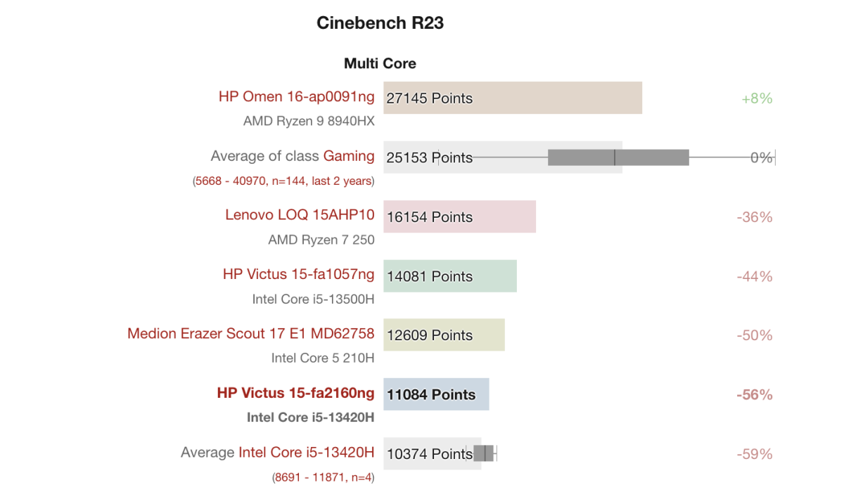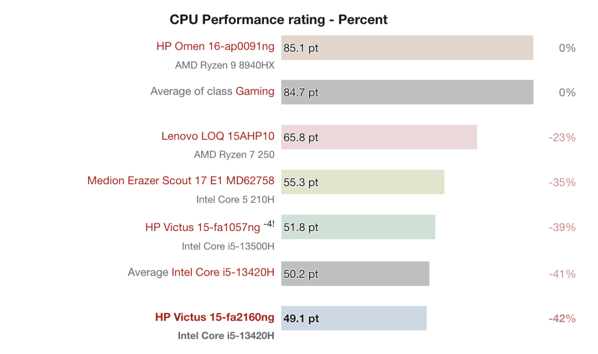 Trong các bài benchmark, hiệu năng của Victus 15 nằm ở phía cuối bảng xếp hạng, dù các CPU tiền nhiệm như Core i5-13500H hay Core i5 210H trên Scout 17 E1 chỉ nhỉnh hơn một chút. Trong khi đó, Ryzen 7 250 vượt trội hơn khoảng 30% hiệu năng, còn Ryzen 9 8940HX trên Omen 16 thậm chí mạnh hơn gần 70%.