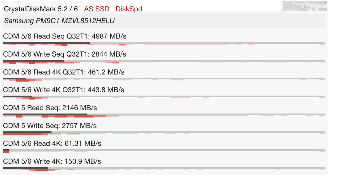 Cụ thể, theo kết quả từ CrystalDiskMark 5/6, ổ SSD đạt tốc độ đọc tuần tự Q32T1 lên tới 4,987 MB/s, tốc độ ghi tuần tự 2,844 MB/s. Tốc độ đọc và ghi 4K lần lượt đạt 461.2 MB/s và 443.8 MB/s, trong khi kết quả CDM5 cho thấy tốc độ đọc tuần tự 2,146 MB/s và ghi tuần tự 2,757 MB/s, tốc độ 4K lần lượt là 61.31 MB/s và 150.9 MB/s. Dù chưa vượt trội so với một số đối thủ, SSD này vẫn cung cấp trải nghiệm mượt mà khi khởi động hệ điều hành, load game hay chuyển dữ liệu nặng.