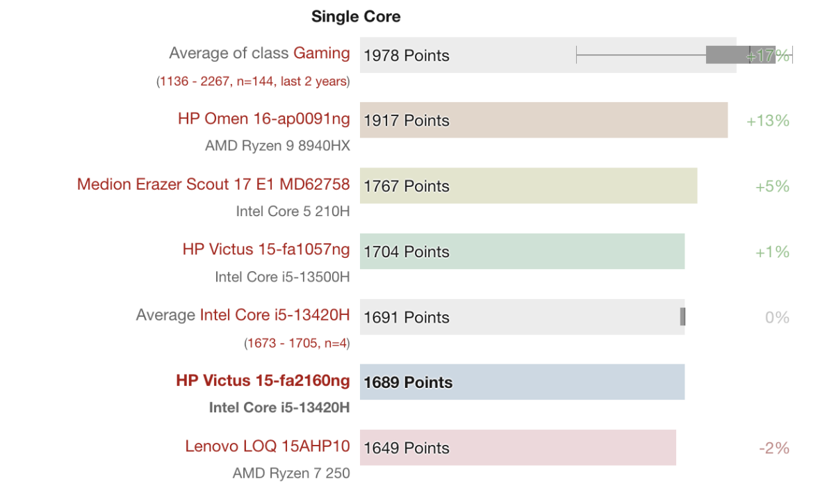 Ở bài test đơn nhân, i5-13420H trên Victus 15 đạt 1,689 điểm, tương đương mức trung bình của dòng i5-13420H (1,691 điểm). Hiệu năng đơn nhân của máy vẫn ổn định, nhưng nhìn chung không vượt trội so với các CPU Ryzen mạnh hơn, chẳng hạn Ryzen 9 8940HX đạt 1,917 điểm (+13%) và Ryzen 7 250 đạt 1,649 điểm (-2%).