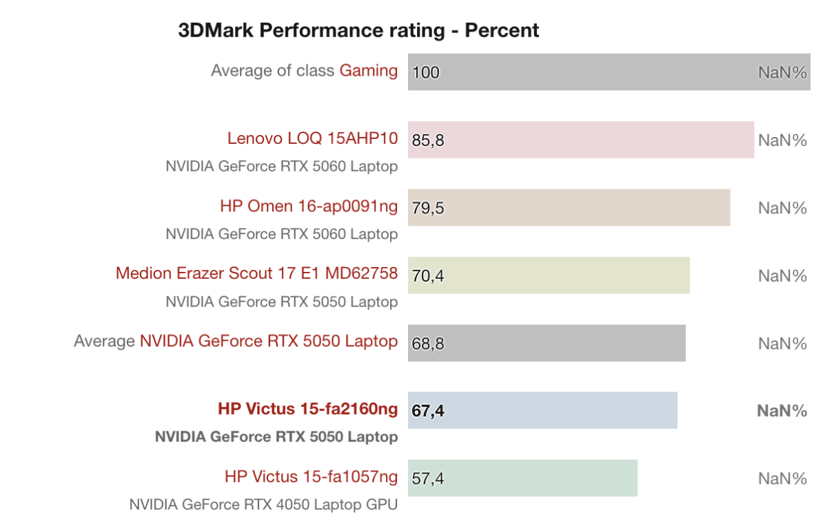 Kết quả 3DMark cho thấy RTX 5050 trên HP Victus 15-fa2160ng đạt 67.4%, thấp hơn một chút so với mức trung bình của dòng RTX 5050 (68.8%). So với các đối thủ, Medion Erazer Scout 17 E1 với cùng GPU đạt 70.4%, nhỉnh hơn Victus 15 vài phần trăm.