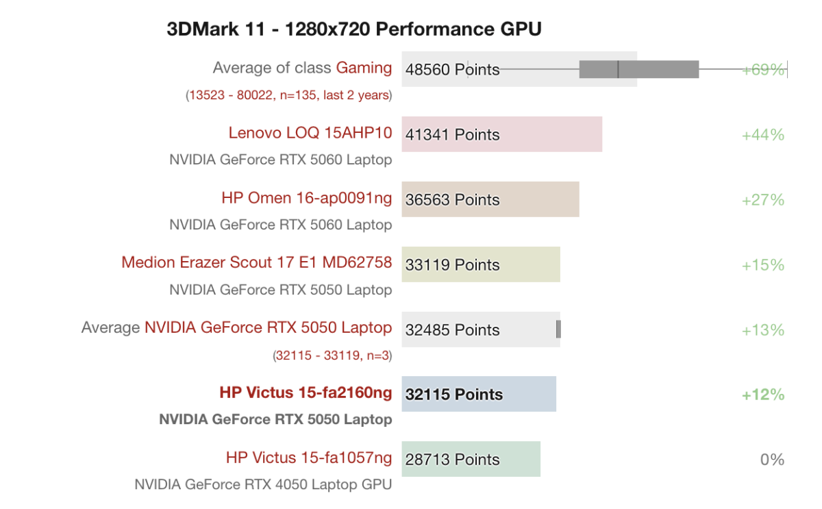 Với bài test 3DMark 11 ở độ phân giải 1280 x 720, RTX 5050 trên HP Victus 15-fa2160ng đạt 32,115 điểm, cao hơn 12% so với mức tham chiếu trung bình của dòng RTX 5050 (32,485 điểm). So với các đối thủ cùng GPU, Medion Erazer Scout 17 E1 đạt 33,119 điểm (+15%), nhỉnh hơn Victus 15 một chút.