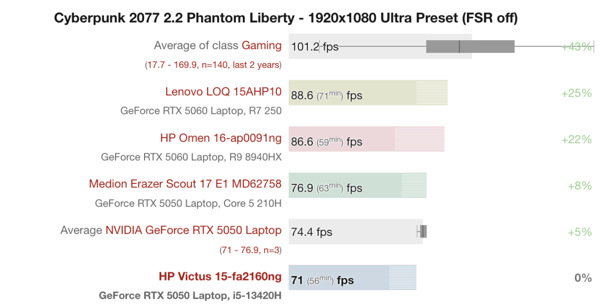 Cyberpunk 2077 2.2 Phantom Liberty với thiết lập Ultra ở Full HD, HP Victus 15-fa2160ng với RTX 5050 và i5-13420H đạt trung bình 71 FPS (FPS tối thiểu 56), đúng bằng mức tham chiếu 0% của dòng RTX 5050 (74.4 FPS trung bình).